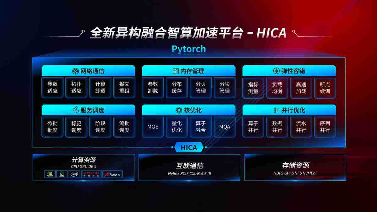 通过自研的服务层、、、中间适配层、、、、以及调度编排算法,,采用数据并行、、、、模型并行等多种并行方式,,,,把并行计算任务进行有效的分解,,,使其分别由相应的软件栈和算力资源来承接。。。。当GPU资源变化,,,,HICA可以实时动态调度计算子任务并调整模型拓扑和架构,,以充分聚合各种算力资源。。。
