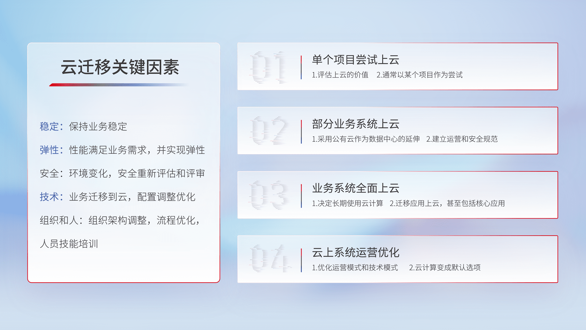 结合实际业务,,,从规划设计、、云平台选型、、、、云原生改造、、、、数据迁移、、、集成交付,,,,迁移全过程为客户识别最佳上云路径,,做好风险识别管理,,,,设计网络架构、、、、身份权限、、、、安全审计合规、、操作审计、、、、日志审计、、、监控告警策略、、、、多站点容灾设计等,,对云上基础设施进行整体规划,,,,提升IT治理水平,,,以满足弹性、、、高可用、、、高性能的需求。。。