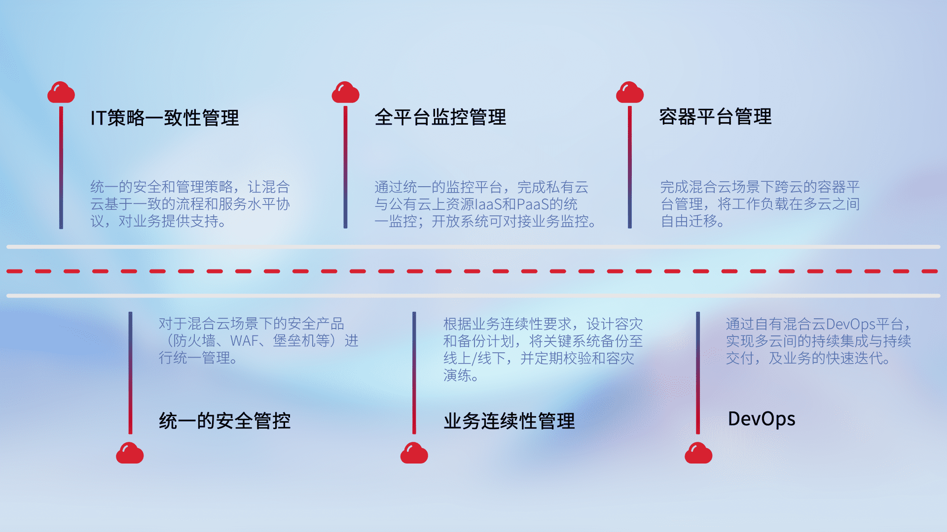 通过多云纳管,,以统一的资源数据模型把客户的云资源进行抽象和封装,,,进而实现对多云资源的统一操作,,,保障云资源管理的可靠性、、、稳定性与可用性。。。量身定制化运维内容,,,,配置、、、、开发运维、、、补丁管理、、备份、、监控、、、、认证和访问管理、、审计和日常巡检等,,保障在用云过程中的可靠度,,,稳定度以及高可用率。。