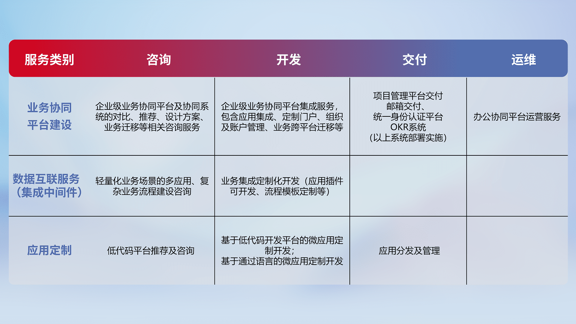 针对钉钉、、企微、、、IDaas等平台级产品提供产品的规划、、、方案、、交付、、、、定制化开发等服务,,,实现如统一协同办公、、、智能客户服务、、、、混合会议管理、、、、智能数据查询、、、、等业务场景,,实现数字化转型。。。。
